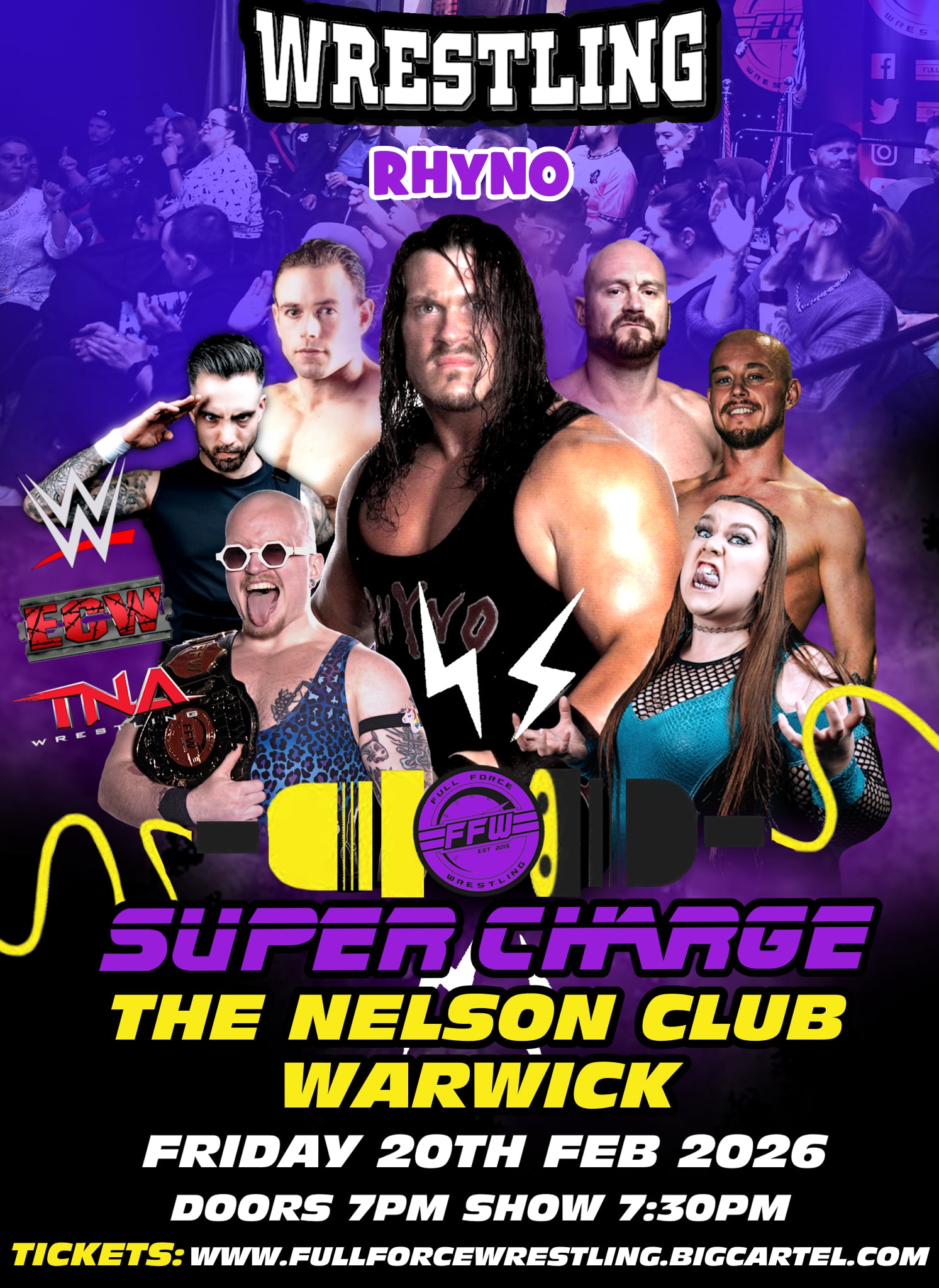 FFW Returns to its Home venue of The Nelson Club Warwick on the 20th February 2026 for Super Charge featuring former TNA, ECW, and WWE Star Rhyno plus all your favourite FFW Stars this venue sells out fast so be quick to avoid disappointment.